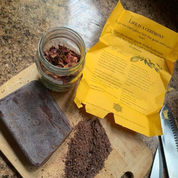 - Chop your cacao. You can pre-chop and store it airtight, or chop it fresh each time — infusing it with gratitude and intention.