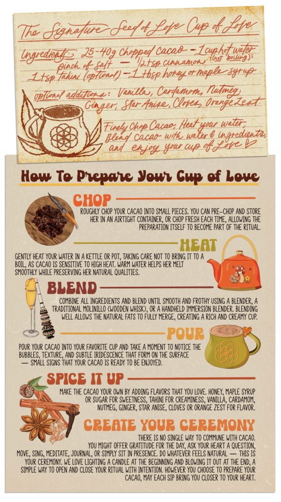 How to prepare your cup of love Where the Magic Begins Preparing cacao is an invitation to slow down and connect. Take your time and make your cup in whatever way feels good to you.
