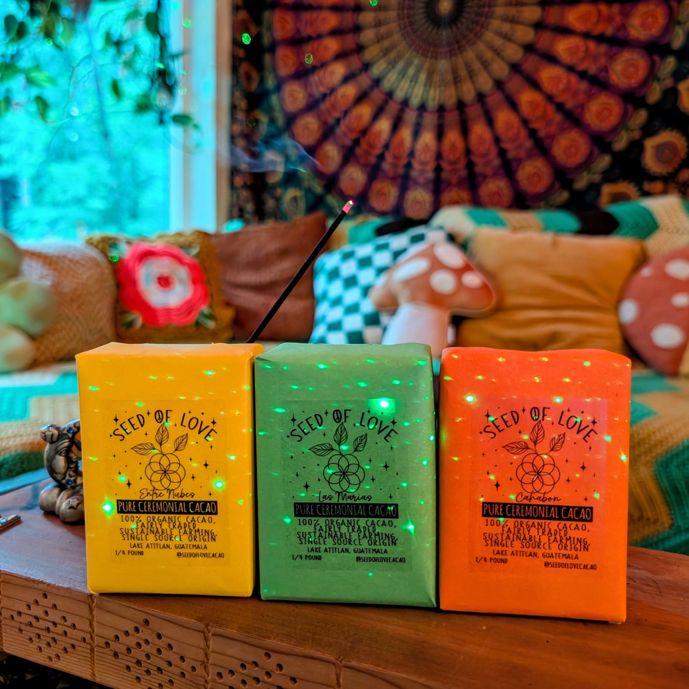 Explore the rich diversity of Guatemalan ceremonial cacao with this mini multipack, featuring three 100% pure, small-batch origins: Las Marias, Cahabon, and Entre Nubes. Each mini block offers a unique flavor profile and energetic signature, handcrafted with love and reverence for the land and the communities who grow it.