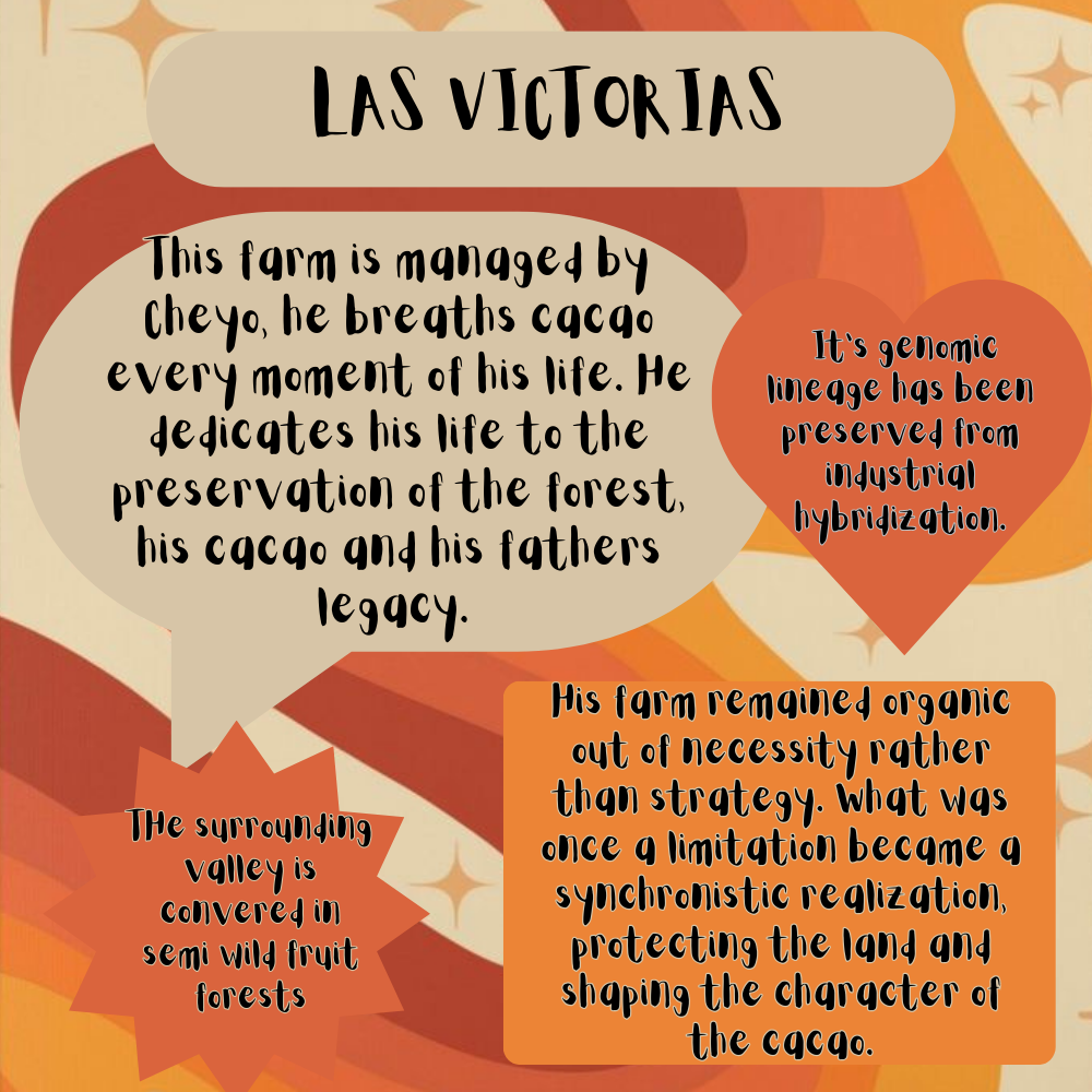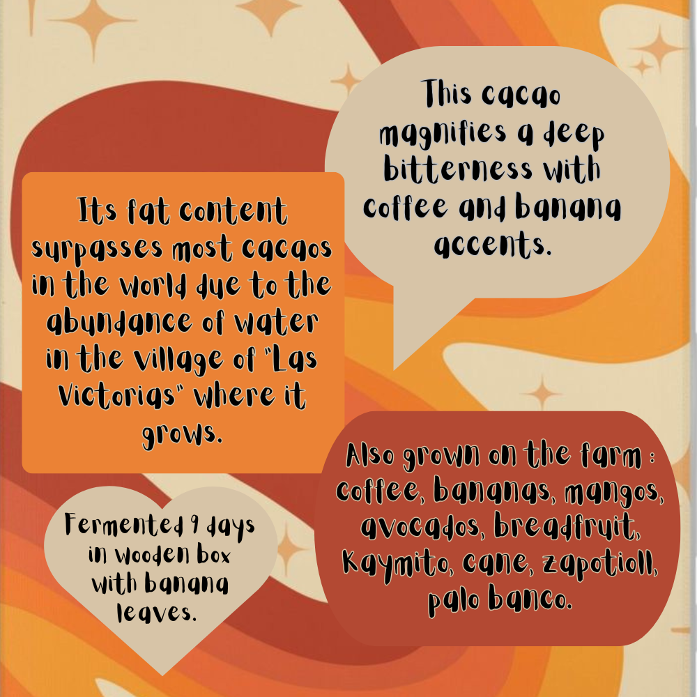 Flavor Profile : A deep bitterness with coffee and banana accents. Its fat content surpasses most cacaos in the world due to the abundance of water in the village of “Las Victorias” where it grows.