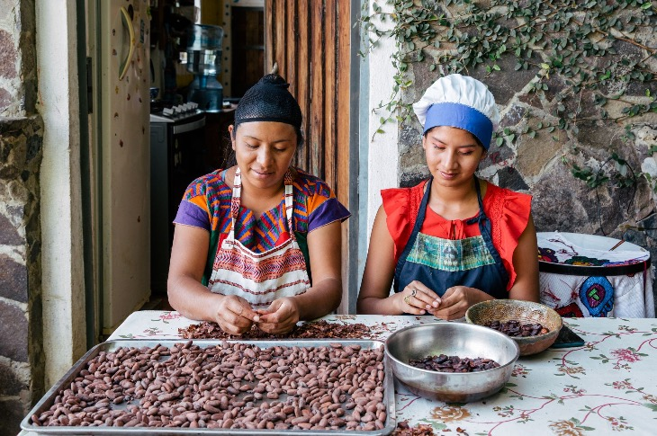 Once dried, the beans are hand-peeled by women’s cacao processing collectives in Guatemala, who work from their homes, allowing flexibility within their daily lives.